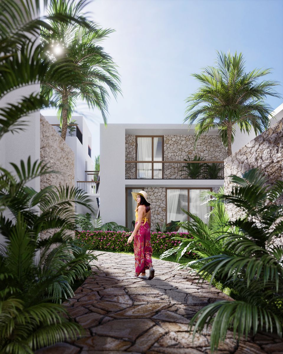Olbrzymi procent śladu węglowego w procesie budowy związany jest z transportem materiałów. Nasze konstrukcje oparte są na lokalnie produkowanych cegłach, dostępnej na działce skale koralowca, a wnętrza wyposażone będą w wytworzone przez lokalnych stolarzy meble. Wszystko to po to aby zminimalizować wpływ procesu realizacji na środowisko oraz aby wesprzeć rozwój lokalnych firm. Ponadto minimalizujemy ruch samochodowy na osiedlu, poprzez wyznaczenie strefy parkingu oraz promowanie komunikacji między budynkami ścieżkami pieszymi otoczonymi zielenią.